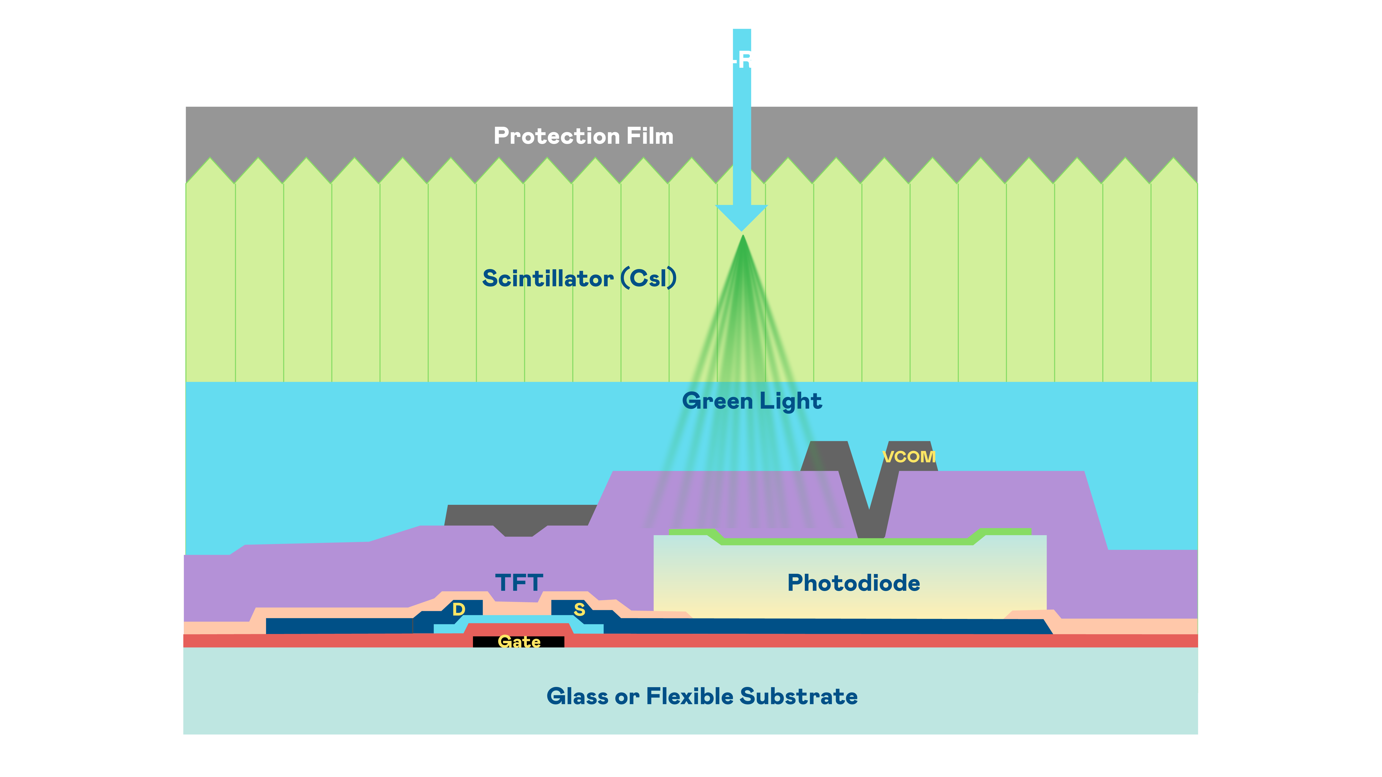 尊时凯龙的X光影像感测阵列使用薄膜电晶体 (TFT) 作为每个像素的读取开关,搭配光电二极体(Photodiode)的光电转换元件,用以感测X光影像讯号。